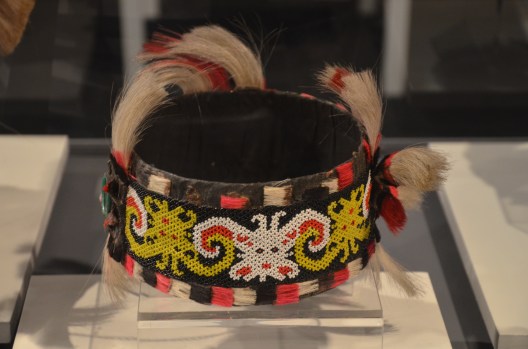 This headdress is worn by the women of Dayak Kenyah. It is decorated by yellow and white beads in the motif of ancestral spirits. It is also decorated with white horse hair at the top.