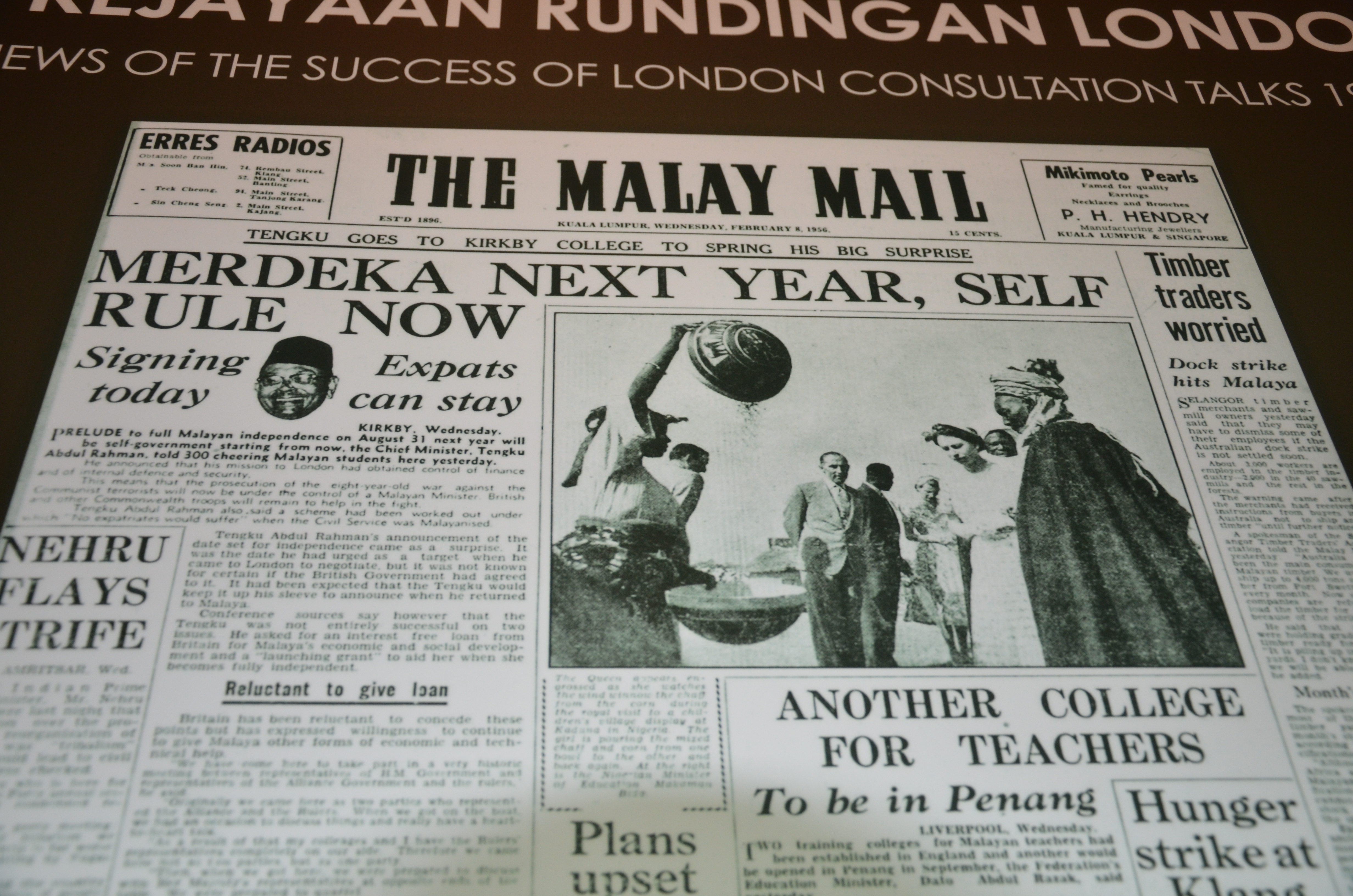 In 1956, the Chief Minister, Tunku Abdul Rahman, led a three week delegation to London to negotiate with the British on independence. The front page of 5 local newspapers reporting on the success of this mission is a new addition to the gallery. The five newspapers are The Malay Mail (English daily featured on the left), The Straits Times (another English daily), Warta Negara (a Malay daily written in Jawi script), a Tamil daily (Tamil Nesan) and a Chinese daily.