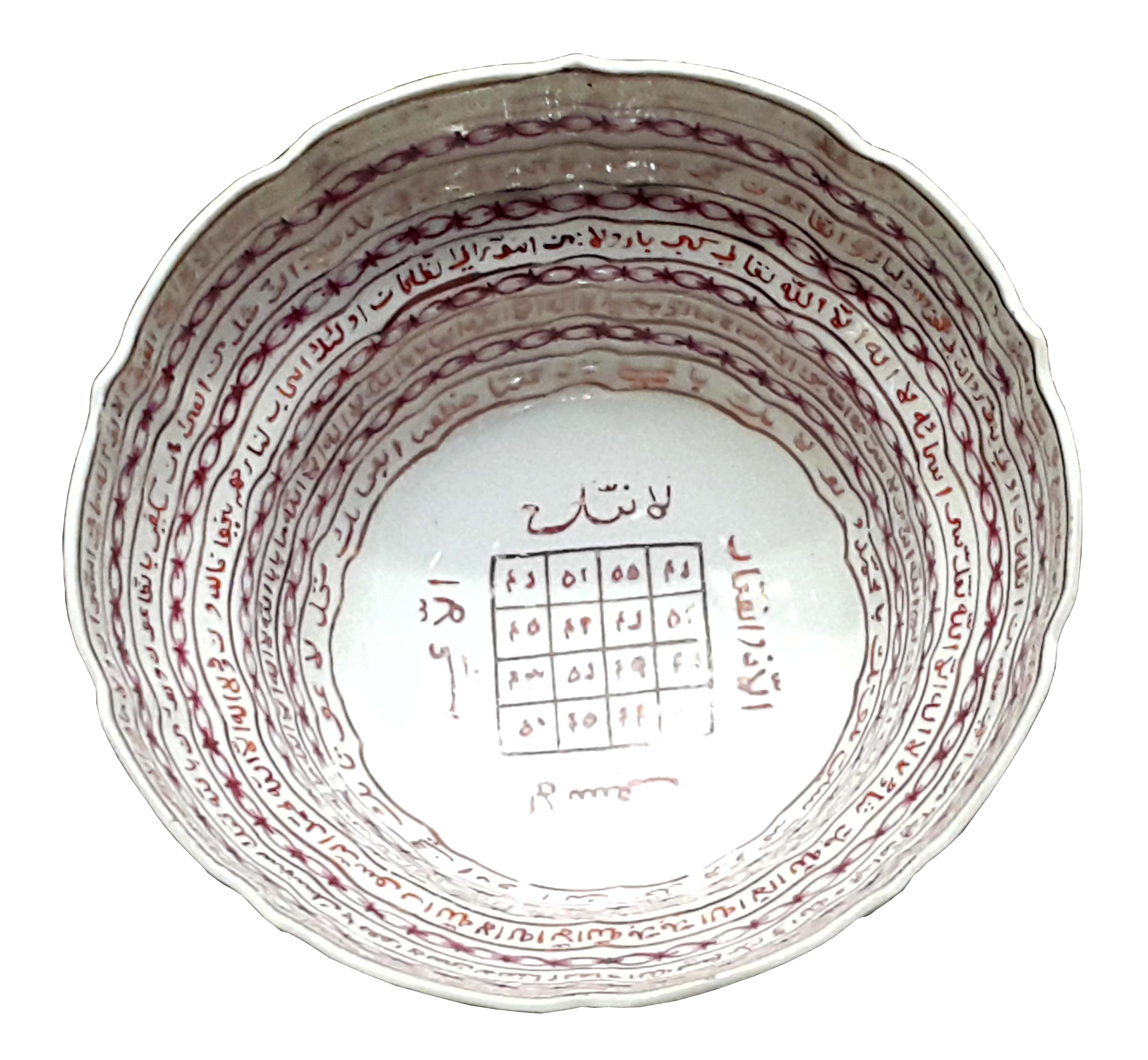 During the Tang Dynasty (618-907) Chinese ceramics with Islamic script were already produced in China and transported along the maritime trade routes by Arab and Persian traders. After the Tang Dynasty, ceramics with Islamic inscriptions were no longer produced. Only in the early 16th Century did they appear again. The Magic Square Bowl in Gallery B is from the 18th Century Qing Dynasty.