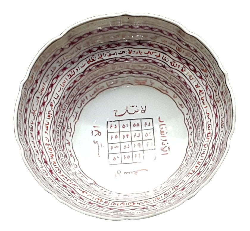 Amidst a number of examples of the Islamic influence on metal and ceramic wares in a showcase in Gallery B, a small bowl can be found with the intriguing description ‘Magic Square Bowl’. It looks like a small Chinese rice bowl but is decorated with Islamic script. On the inside of the bowl is a square consisting of sixteen smaller squares, also containing Islamic writing. Was it used to perform magic, or was it magical in itself?