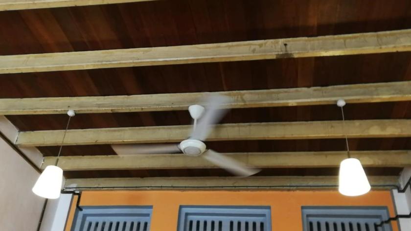 All the yellow beams in the ceiling are original, but the brown wood is a replacement because the original wood was rotten.