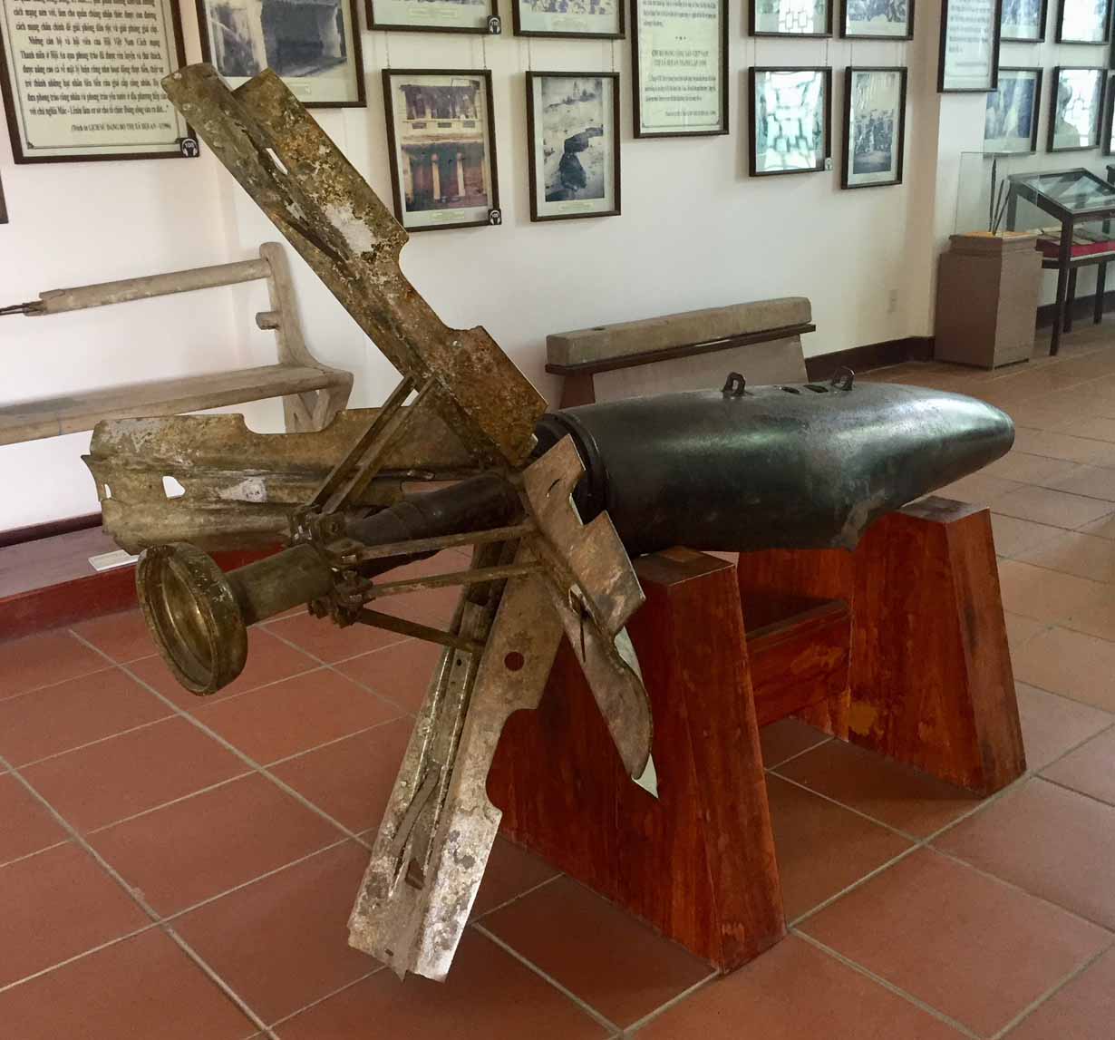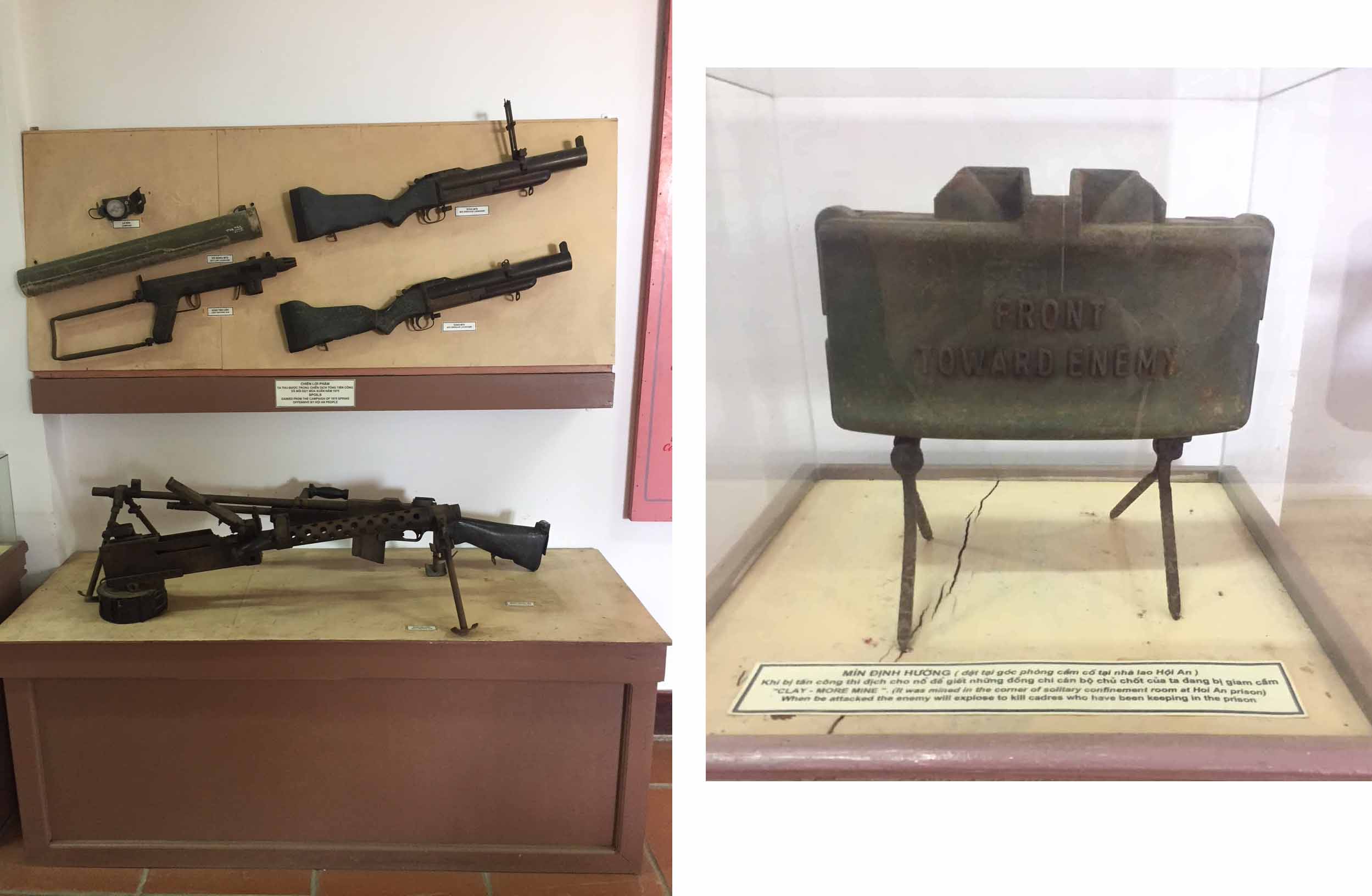 The gallery at the top floor exhibits artefacts from the Resistance War with the Americans. Many types of weapons and machine guns, parts of planes, bombs, clothing, torture instruments and even a trap of iron spikes can be seen here, supplemented by photos and information boards in Vietnamese.
