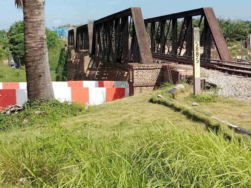 Next was the Buloh Kasap Bridge, which shared the same fate as the other bridges. A then and now photo shows how the bridge was rebuilt at speed by the Japanese. The ends of the bridge are still intact today. On one side damage from artillery shells can be seen. Markings on the concrete pillars below show that the bridge was built in March 1926.