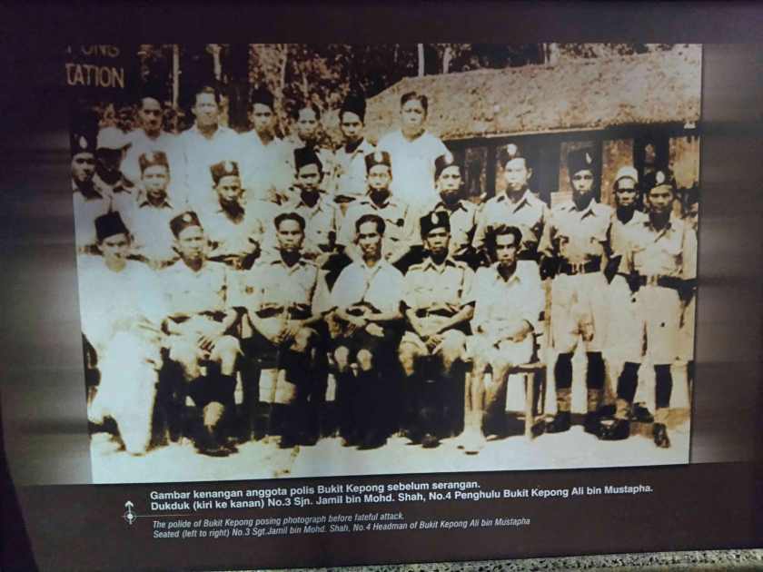 Then we made a “Quantum Leap” (refer old TV series) from the War to the Emergency – to Bukit Kepong, the scene of the annihilation of the wooden riverside police station by the communists on 23rd February 1950. Bukit Kepong is about 60km from Muar town. From the hillside across the station about 180 communists led by Muhammad Indera, looked down on the police station. In the police station were 25 policemen led by Sergeant Jamil Mohd. Shah. At 4.15am, the firing started. The police stood their ground, refusing surrender despite their families being killed as well. The station was set on fire and through all this the police defended the station. After 5 hours, it was over and the communists left leaving only four policemen and nine family members as survivors. This story as with the others is overwhelming.