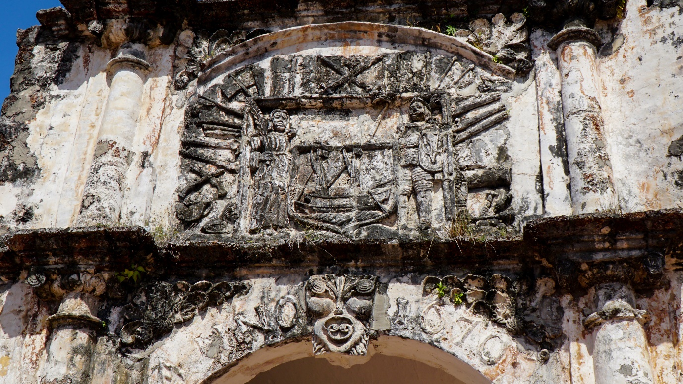 Focusing on the top of Porta de Santiago, Colin pointed out the Dutch emblem which comprises of a rectangle that is surrounded by battle weapons. Within the rectangle, a lady holding a stalk of wheat is placed on the left and a soldier bearing a shield with the words “VOC” is on the right, separated by a shield in the centre. On the front side of the Porta de Santiago, the year “1670” can also be clearly observed.