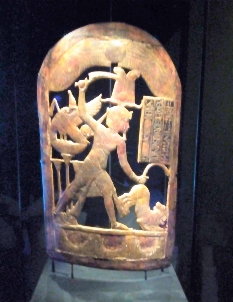 King Tut appears in various forms. On this reed skiff, he appears as Horus, son of Osiris who is the Lord of the Underworld. Holding a coiled rope in his left hand, he aims a spear at the evil god Seth, the jealous brother of Osiris. This artefact depicts the Pharaoh as a brave warrior ready to face the underworld.