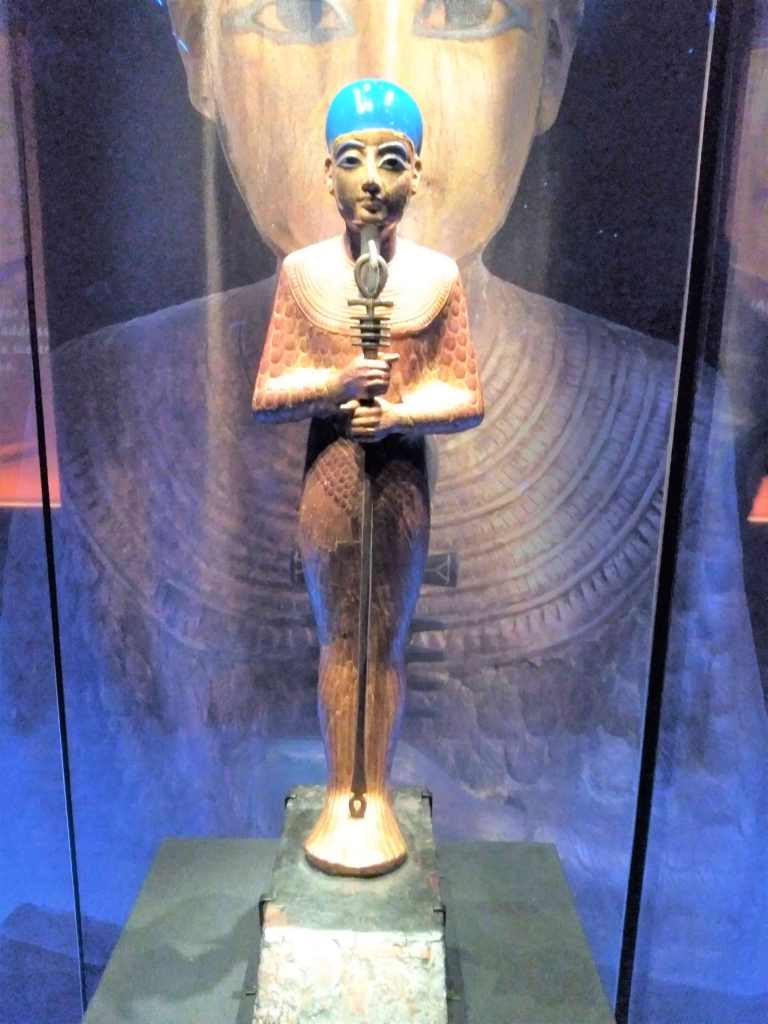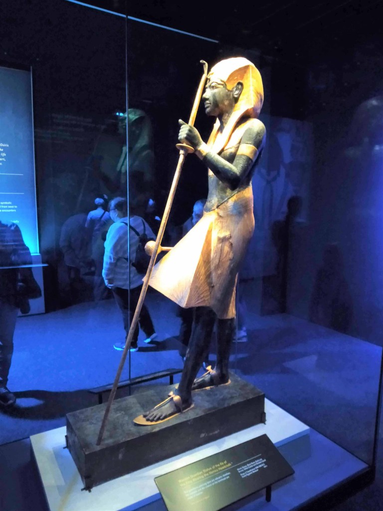 There are so many more artefacts at the exhibition; these cannot be described here or this article will become a book. However, the final exhibit is a beautiful quartzite statue of King Tut. It is one of a pair, which may have stood in King Tut’s mortuary temple. King Tut’s name was inscribed on the belt, but it was replaced by the name of his successor, Ay, whose own name was also replaced by his successor, Horemhab.