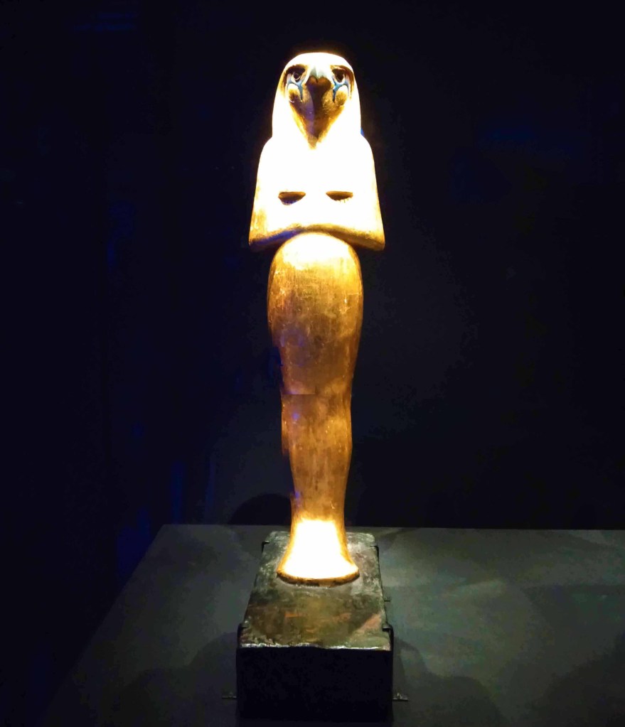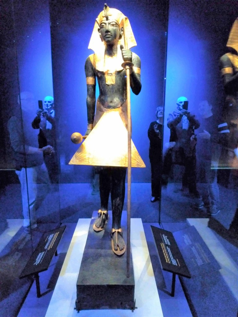 After a bit of a wander, finally, there he was, lying amassed in amulets and gold – with gold finger and toe stalls, gold sandals, and a scarab beetle sitting on his chest between folded golden arms. His arms hold a flail (symbol of royal power) and a crook (indicating the King acts as a shepherd to his people). While the artefacts are genuine, King Tut’s mummy is a superbly created replica.