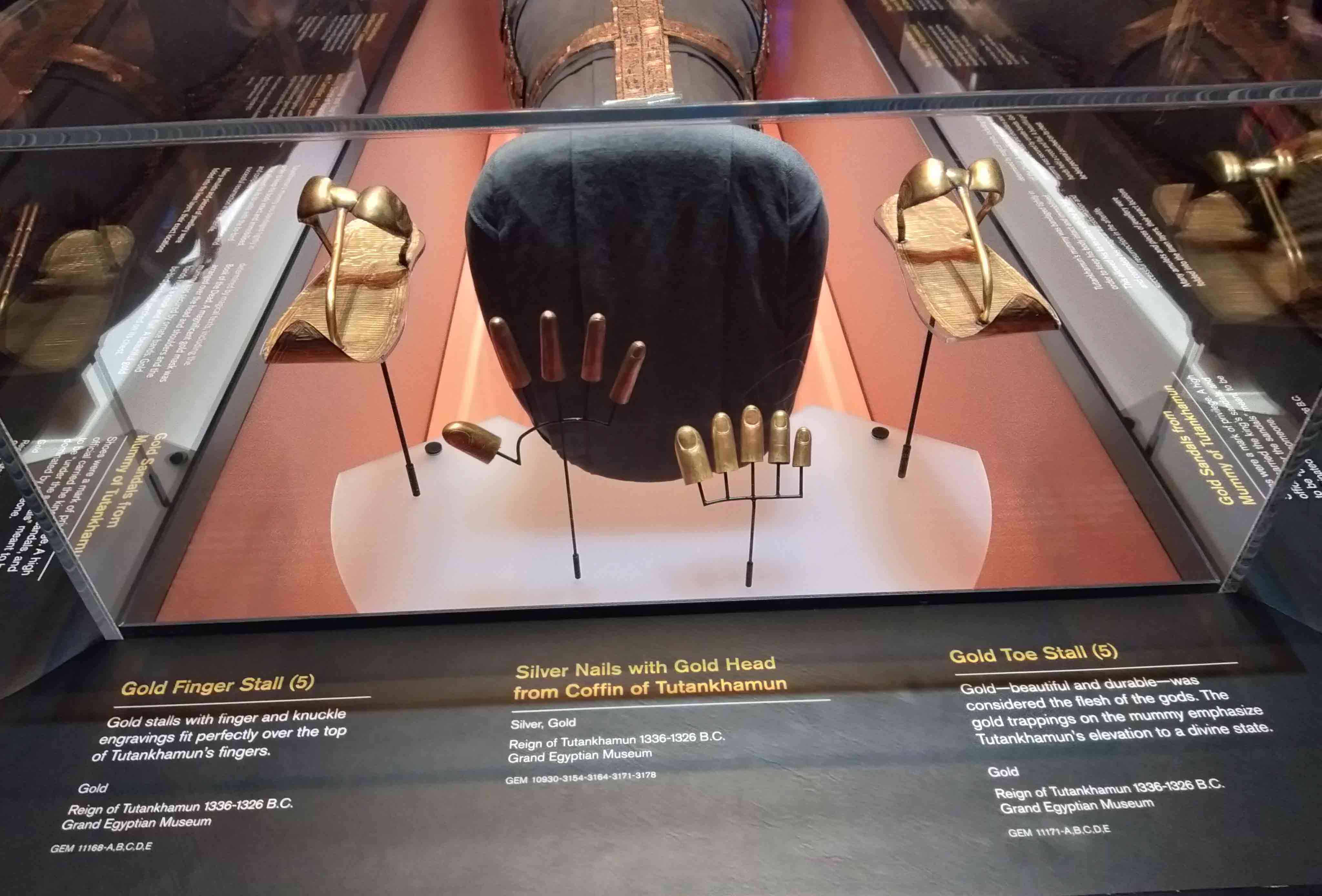 After Carter removed the last of the last of the three nested gold coffins, revealing the mummy of King Tut, he found ornaments and trappings. These include gold finger and toe stalls (thimbles); gold sandals; silver nails; amulets within layers of linen, with gold bands inlaid with coloured glass to form a hieroglyph bearing the King’s name; and protective magic spells. Gold is considered the flesh of the Gods, hence its use in almost anything.