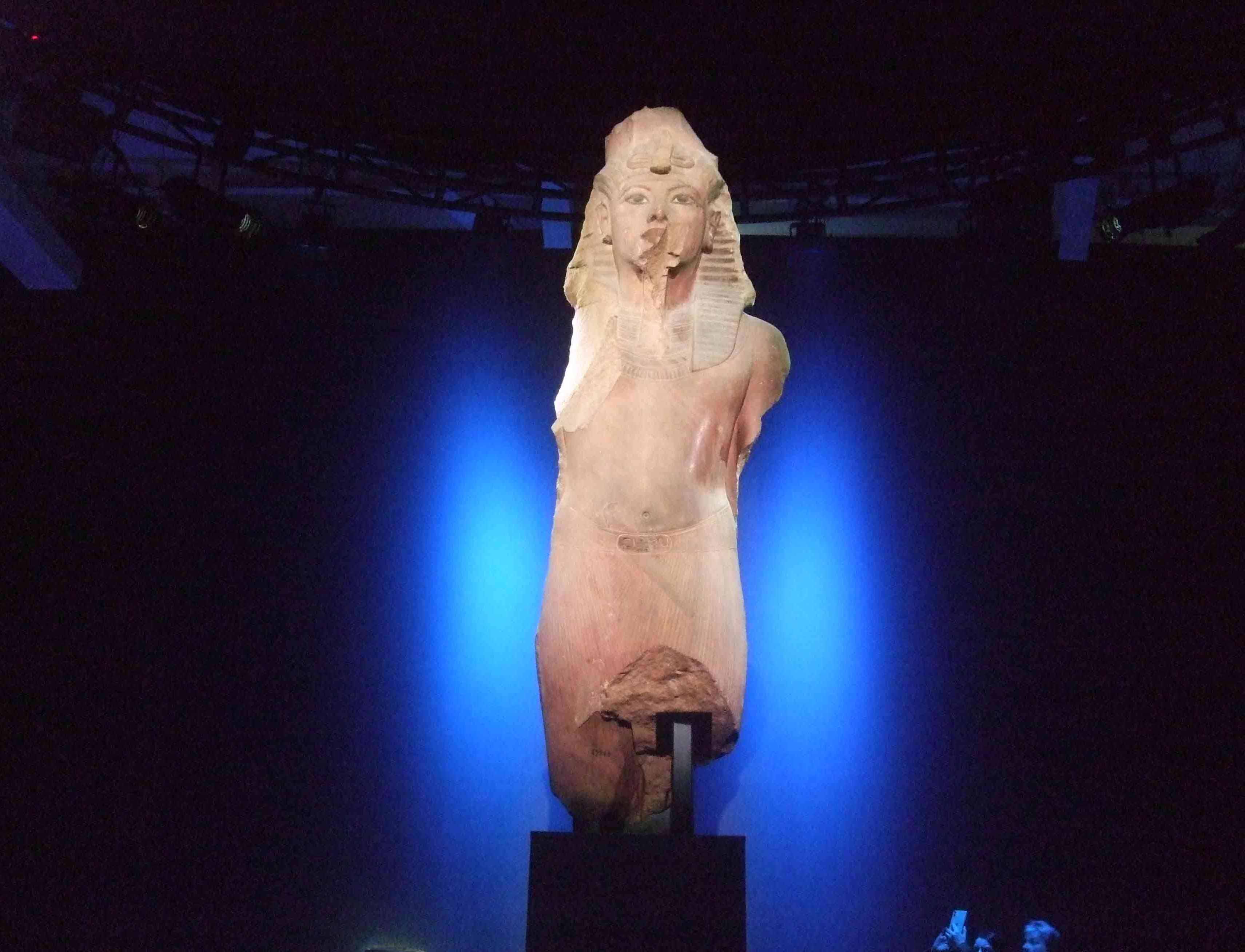 Tarek points out that the eyes, made out of volcanic obsidian, have a distinct feature. When Carter looked into the eyes, they were not looking back! They are said to look into the afterlife and eternity. Truly amazing sculptors! The pictures below show the statue on display at the exhibition from two angles, as well a picture of how they were placed originally.