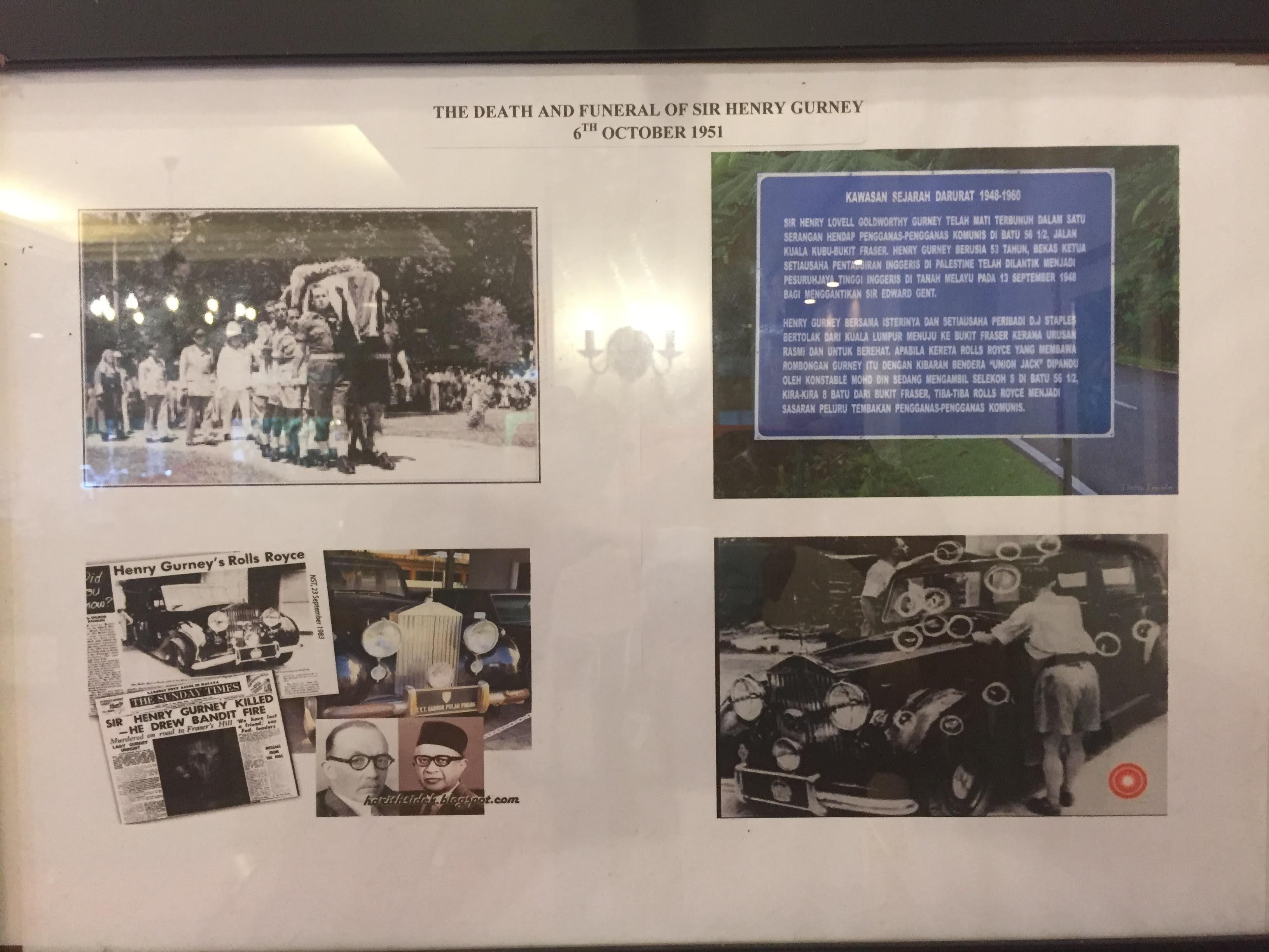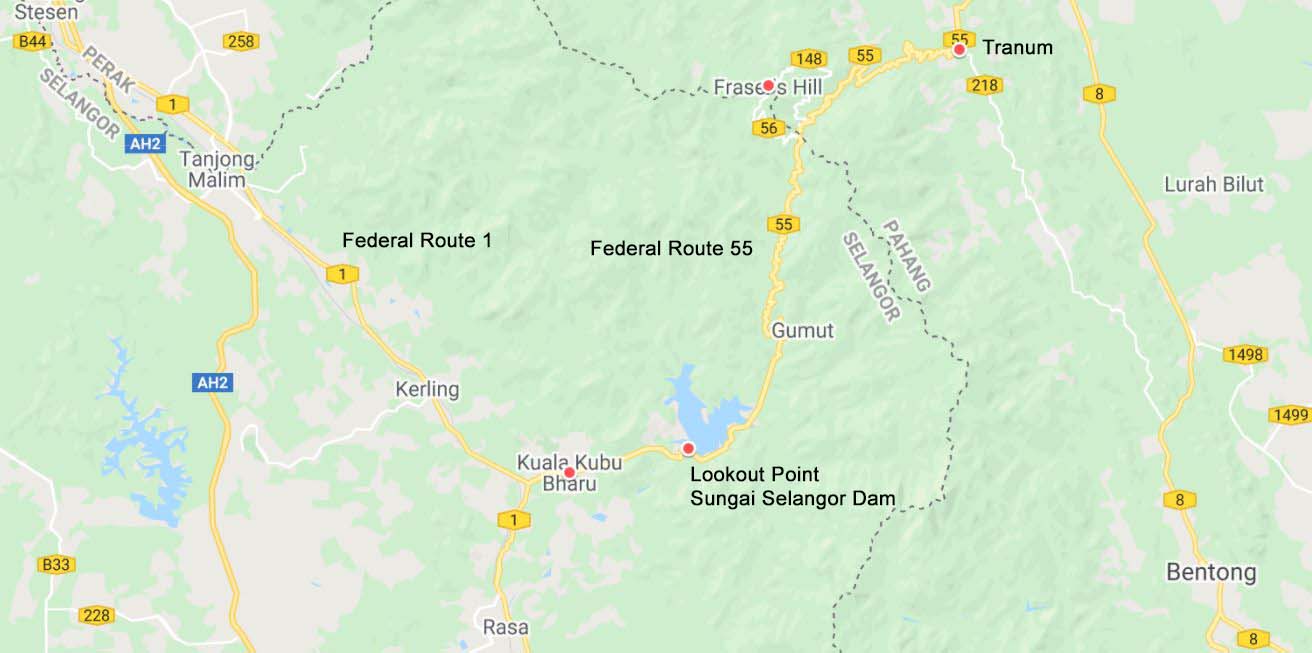 These events are closely related to Federal Route 55. Sir Henry Gurney was assassinated on 6 October 1951 by communist terrorists (CT) at Mile 56 ½, Kuala Kubu Road (90.91 km, distance measured from Kuala Lumpur), about 8 miles (12.87 km) from Fraser’s Hill and about 2 miles (3.22 km) before The Gap. Federal Route 55 is the main access route to Fraser’s Hill, whether from Pahang or Selangor.