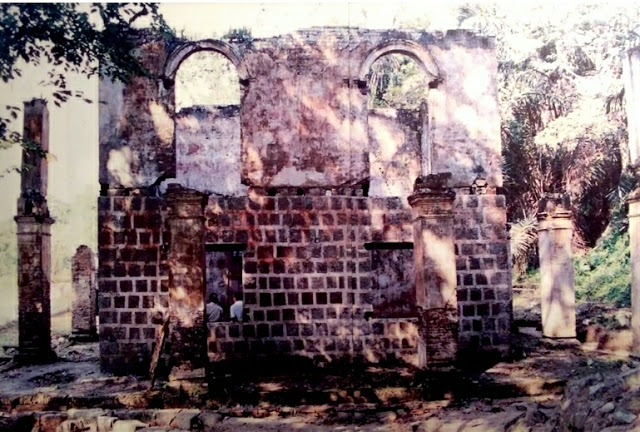 Next to be built was the (6) Jugra District Office. Similar to the police station, the District Office was a two-storey granite and brick building and it also housed a bank and a court. It was by no coincidence that the building housed a bank and a court. The District Officer was indeed a Tax collector and Magistrate! The building has disintegrated and, today, only its ruins can be seen. It is located on the same road that leads to the lighthouses and next to the Chinese cemetery. When the (7) District Officer Residence was ready in 1877, James Innes and Emily moved in immediately. Those days, sightings of tigers in the open were quite common and particularly so in the Kuala Langat district. There was also news of people being killed by tigers. James reported an encounter with a tiger in his garden when he was reading the newspaper. Luckily, nothing bad happened to him. Today, it would be difficult to locate the building, as it may have been completely demolished. The photo below, taken before 1985, showed only one upright pillar.