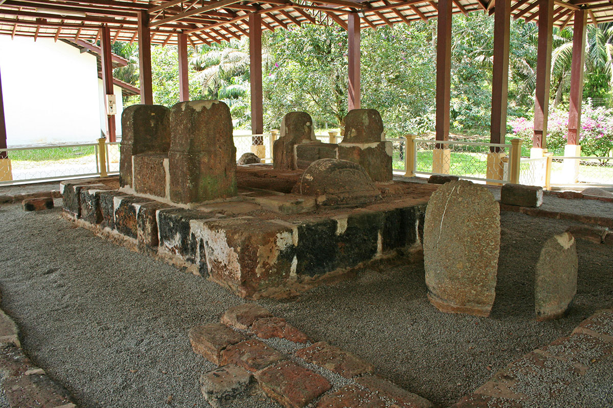(Left) – Inscription tombstone / Photo source : AHMAT MAJANU’S TOMBSTONE AT PENGKALAN KEMPAS AND ITS KAWI INSCRIPTION(Right) – Cluster of three erected inscription stones, namely rudder, spoon and sword respectively / Photo source : Pengkalan Kempas