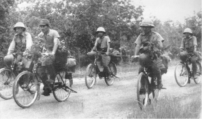 Riding bicycles, a Japanese unit rolls rapidly forward, when the tires went flat, the soldiers continued to ride on the metal rims. Image source: https://warfarehistorynetwork.com/article/the-fall-of-malaya-japanese-blitzkrieg-on-singapore/