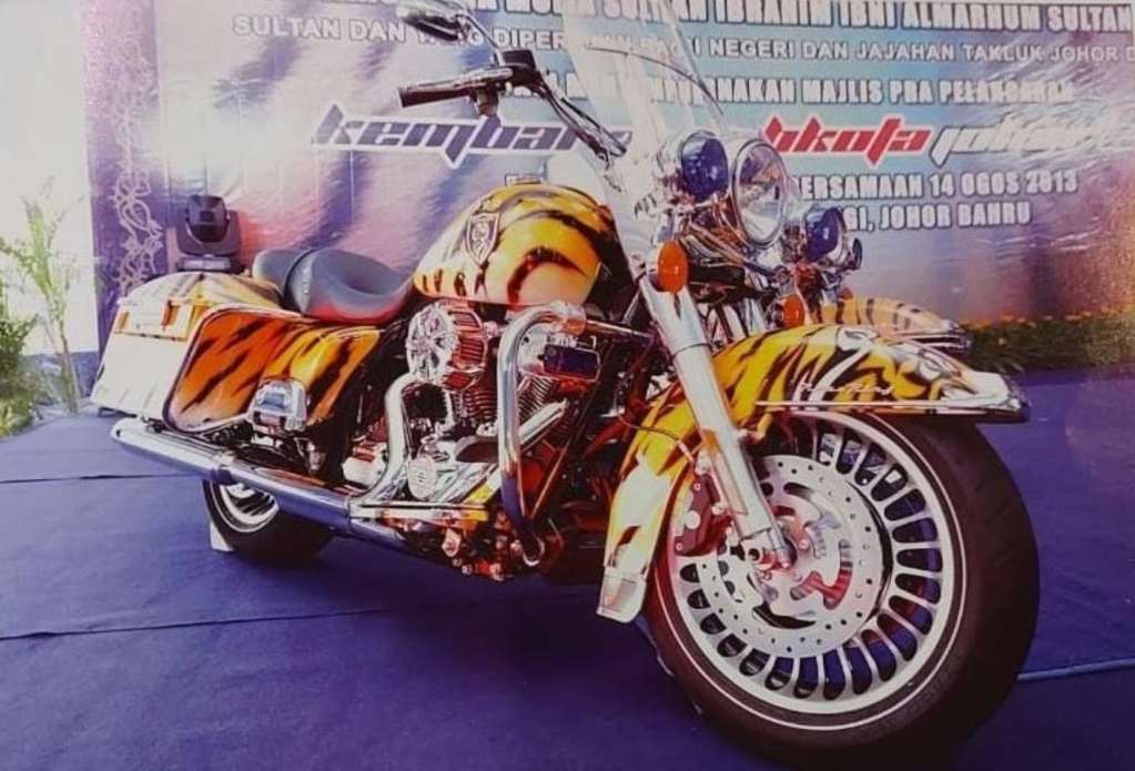 Pix 2: Tiger-striped Harley Davidson Motorcycle – This tiger-striped Harley Davidson motorcycle is a personal collection of His Majesty and was often used in the Kembara Mahkota Johor tour series and Malaysian Motor Week programme.