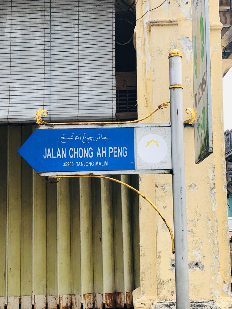Left: one of the original rows of shophouses in Kalumpang still standing today. Right: The road named after Cheong in Tanjung Malim. ‘Chong’ and ‘Cheong’ have been used synonymously.