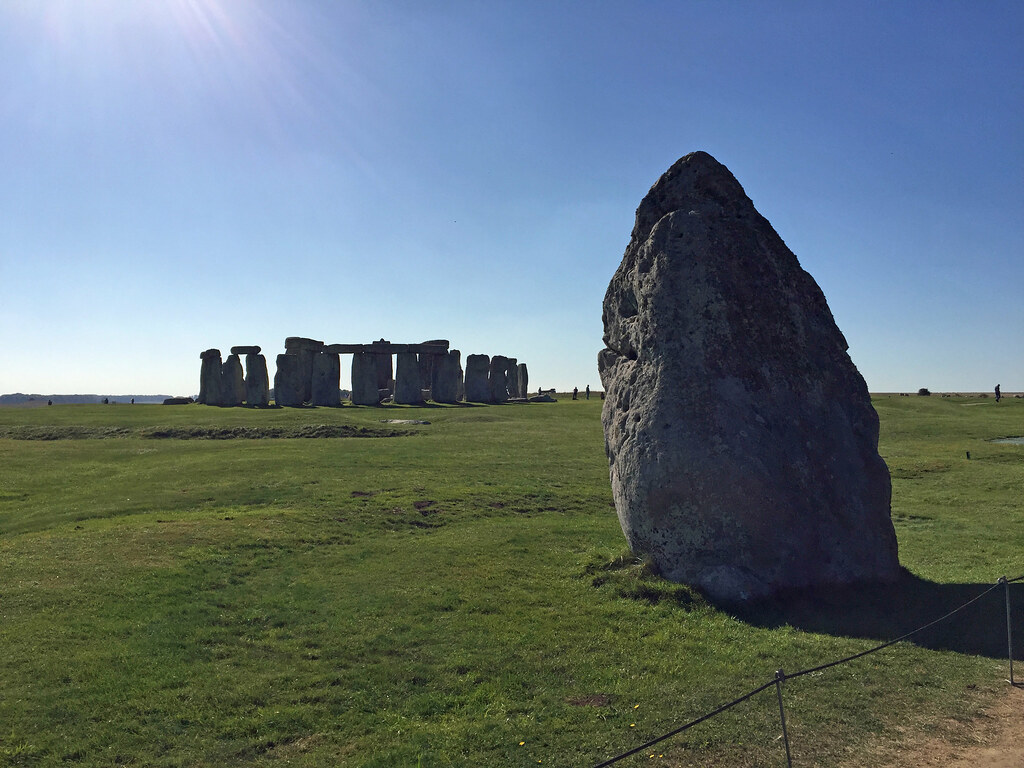The heel stone with Stonehenge in the background. This is a solitary piece of stone 4.7 metres tall with a tapered top. It sits outside the Stonehenge circle, at the start of an avenue that leads to Stonehenge. Image credit: Flicker (attribution: diamond geezer)