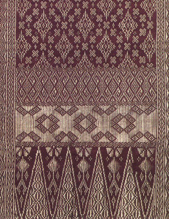 The uniqueness of songket lies in the supplementary weave of gold and silver thread and the complexity of its designs, rich in motifs of an affirmative and natural theme. Songket weaving is commonly done by women. Motifs on Minangkabau songket conform both to their philosophy of the natural world, and their folklore, steeped in traditional wisdom. The common sense of women is noticeable in the symbolism of their songket designs and in the wearing of the cloth. The male sisamping (Malay: samping), the short sarong, must be tied with a large hanging fold at the front, shaped like a tongue. This is a warning to men to guard what they say in public. One can almost hear the admonitory voice of a wife! Many Minangkabau songket motifs retain delightful meanings that have probably been lost elsewhere. The teluk berantai linked chain motif, known to the Minang as saluak berantai, signifies the strength of a community when its members cooperate and work together. Itiak pulang patang ‘ducks returning home at dusk’ reminds that wherever one travels in life, one always returns to one’s home or traditional values. The ubiquitous triangular pucuak rabuang, or young bamboo shoot, represents the usefulness of bamboo in all its stages just as members of the community should be ‘useful in youth and beneficial in old age’.