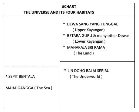 In his book, Prof Hashim explained that according to Dollah Baju Merah, the renowned master puppeteer , the Universe is divided into four habitats with their own inhabitants.
