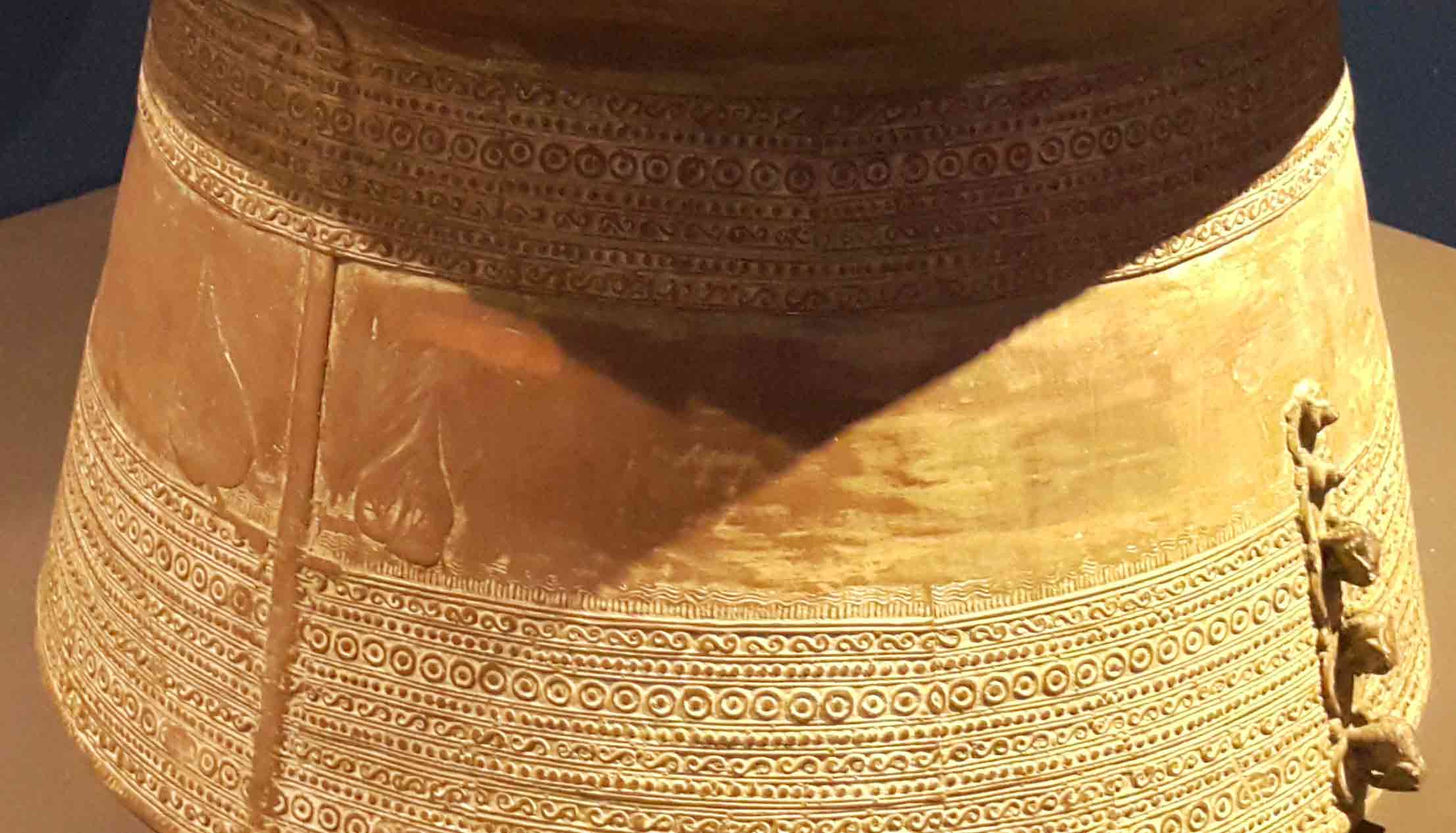 right: The 46 cm tall bronze plaque resembles a robed human body without head and arms standing on two legs. The body part is covered with patterns and motifs of stylised birds. Scholars have yet to ascertain its function