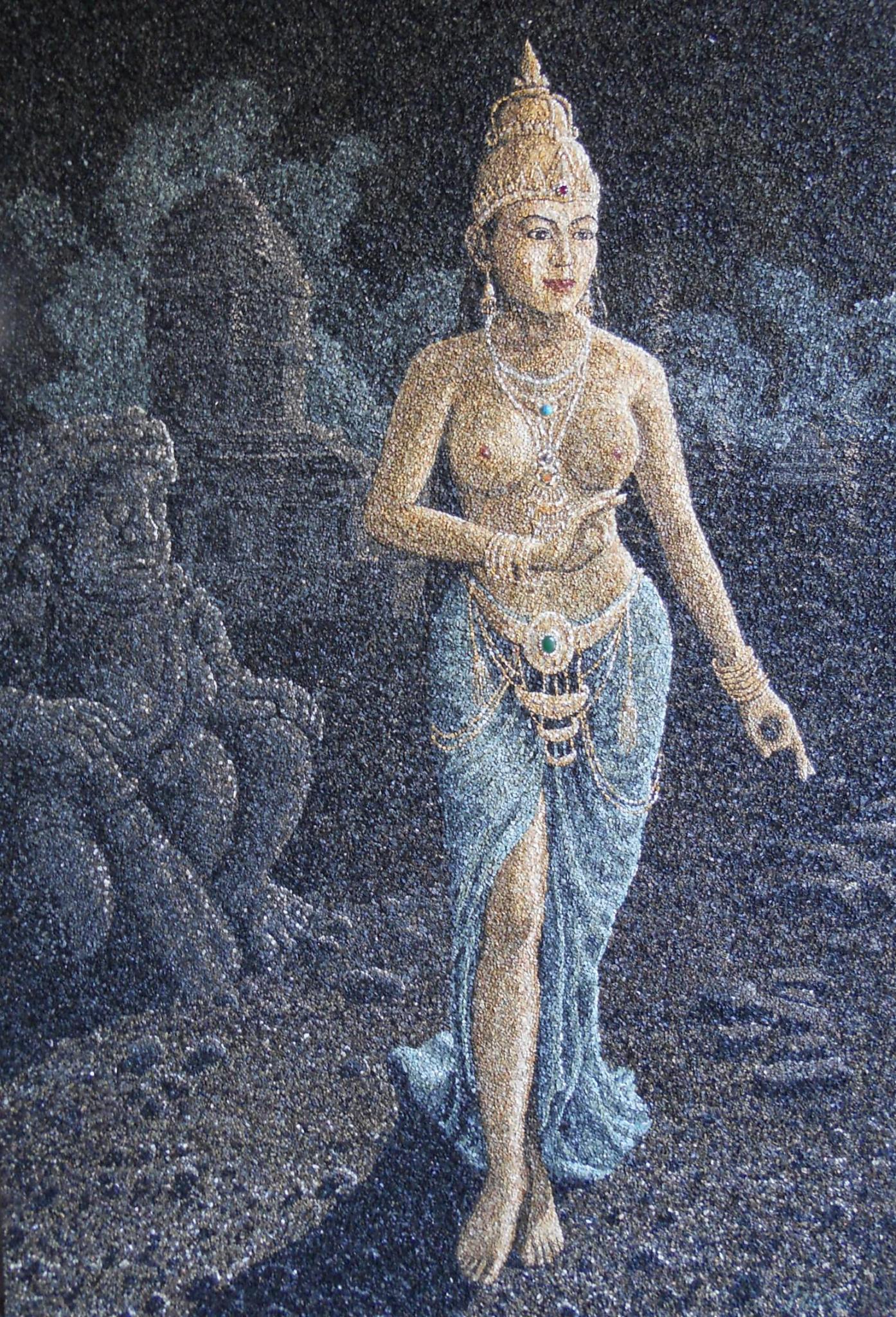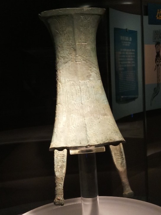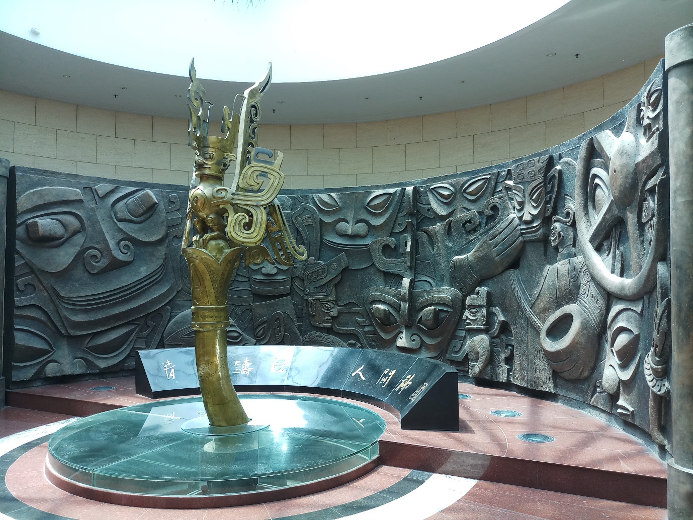The sacrificial life and religious rituals of the ancient Shu people are represented through bronze god statues and wares of gold, bronze, jade and stone. Among them is a 2.62 metres tall statue (Bronze Standing Man) wearing a crown and ceremonial garb, standing upright and barefoot on a cloud-patterned base supported by four elephant heads. His two large hands seem to hold a sacred vessel as if commanding a sacrifice. In the minds of the ancient people, he is a combination of god, wizard and king.