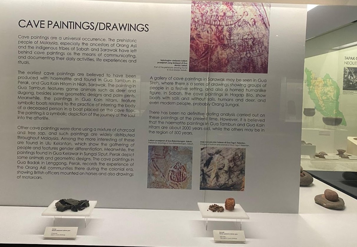 말레이시아에서 가장 오래된 동굴 벽화는 페락(Perak_말레이 반도 북서부 주)의 탐분 동굴(Gua Tambun)과 사라왁(Sarawak_보르네오 섬 북서부 주) 니아(Niah)의 카인 히땀 동굴(Gua Kain Hitam)에서 발견되었습니다.약 2천 년 전에 그려진 것으로 추정되며 동물들, 기하학적 디자인과 상징적인 배들이 그려져 있습니다. 좀 더 최근의 동굴 벽화는 페락 릉공(Lenggong)의 바닥 동굴(Gua Badak)의 것으로, 오랑 아슬리(Orang Asli_말레이시아 토착민) 사람들이 영국 식민 시기의 생활을 그린 것입니다. 남녀로 구성된 그룹이 모임을 하고 있는 모습을 묘사한 동굴 벽화도 있습니다. 동굴 벽화에 쓰인 빨간색 안료는 적철광이며, 검은색 안료는 숯입니다.