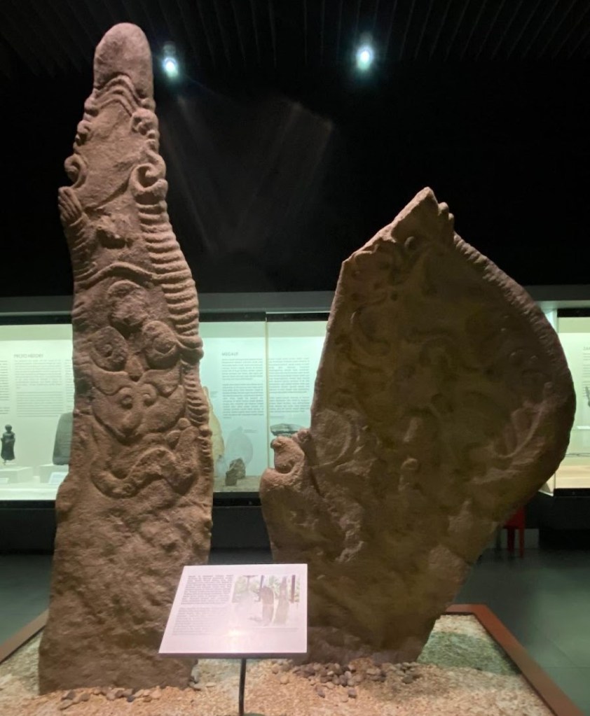 이 거석들은 총3개로 구성되어 있는데, 각각의 생김새에 따라 방향타(배의 방향을 조정하는), 숟가락, 검이라고 불립니다. 방향타 거석에는 말로 추정되는 네 발 달린 동물과 공작으로 보이는 새의 모양이 새겨져 있으며, 윗부분은 코끼리 코 아니면 연꽃 줄기처럼 보입니다. 검 거석은 그 이름이 말해주듯 하늘을 향해 솟은 형태입니다. 검 거석 상단에는 ‘알라(Allah)’라는 아랍 글자가 새겨져 있는데, 어떤 학자들은 나중에 ‘알라’라는 단어를 추가해서 힌두교적인 거석을 이슬람적인 것으로 신성하게 만든 것이라고 추측했습니다. 검 거석의 중간 부분을 장식하고 있는 모티브들은 다양한 해석이 가능합니다. 악령을 물리치기 위해 혀를 내민 얼굴이거나, 비슈누(Vishnu_힌두교의 신), 칼라(Kala_힌두교의 신화적 동물)의 머리, 혹은 링감(lingam_힌두교 시바신의 남성적 창조 에너지를 상징)과 같은 힌두 상징으로 해석될 수 있습니다. 숟가락 거석은 특별한 장식은 없지만, 그 모양이 요니(Yoni_시바신의 아내 샤크티의 여성적 재생 에너지를 상징)와 비슷하기 때문에 링감 모양을 한 검 거석 옆에 놓여진 것일 수 있습니다.