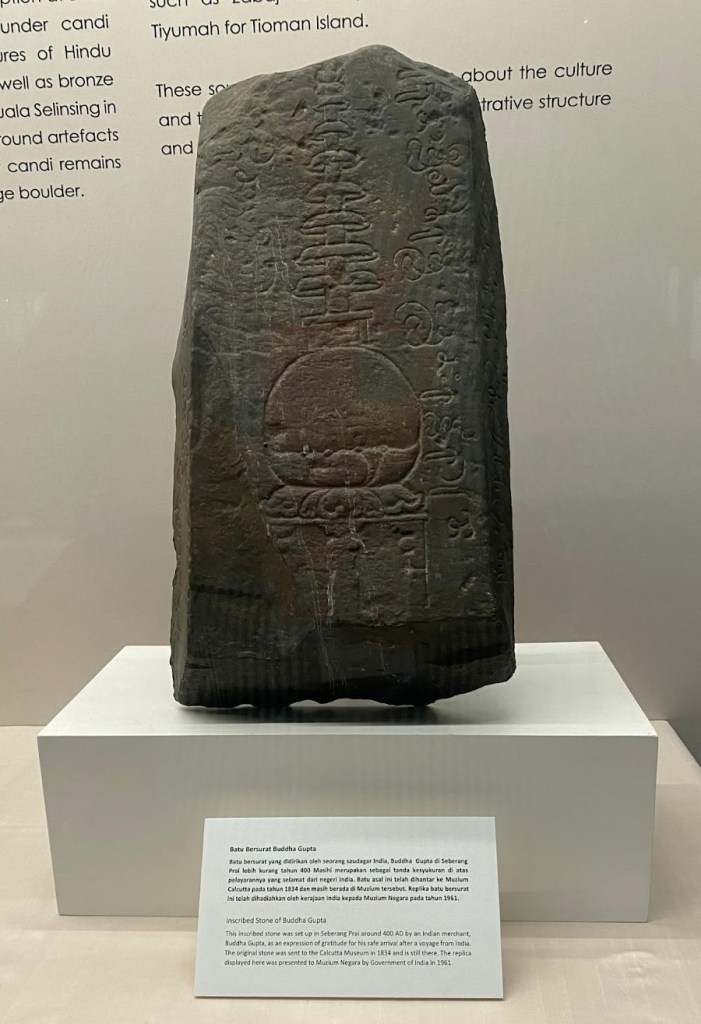 문자는 인류 역사상 가장 중요한 문화적 발전이라고 할 수 있습니다. 문자는 정보와 아이디어를 전파하고, 역사와 사건을 기록하고, 흥미로운 이야기를 들려주는 의사 소통의 수단입니다. 각 지역은 저마다의 속도에 맞춰 고유한 문자 체계를 발전시켰는데, 동남아시아의 문자는 인도나 중국보다 늦었습니다. 아직 자체의 문자가 없는 지역의 문화는 무역을 통해 다른 나라의 문자로 기록되기도 했는데, 그 예가 바로 부다굽타 비석입니다. 이 비석은 1834년, 제임스 로우(James Low) 선장이 페낭(Penang_페낭 섬과 말레이 반도 북서부 일부를 포함하는 주)의 스브랑 쁘라이(Seberang Prai)에서 발견했습니다. 박물관에 있는 것은 복제품이며, 원본은 인도 콜카타(Kolkata)에 있는 박물관에 있습니다.