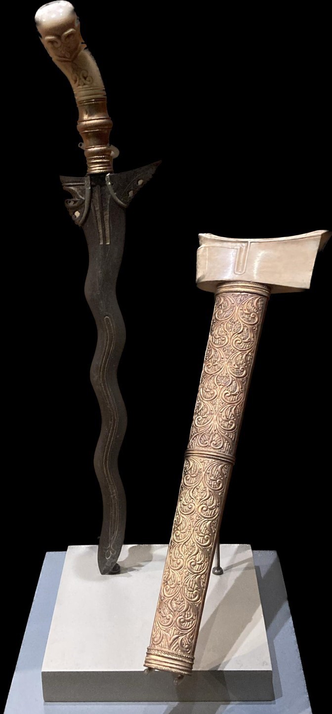 이 셀레베스(Celebes_현 인도네시아 섬으로 술라웨시로도 불림)의 로얄 크리스는 물결 모양의 칼날을 가지고 있습니다. 칼 손잡이는 상아로 만들어졌으며, 손잡이 아래 부분은 구리로 감싸져 있습니다. 칼집의 상단 부분도 역시 상아이며, 금으로 된 칼집 몸통에는 콩 덩굴이 정교하게 새겨져 있습니다. 전체 길이는 크리스와 칼집을 합쳐 43cm이며, 너비는 10cm입니다.