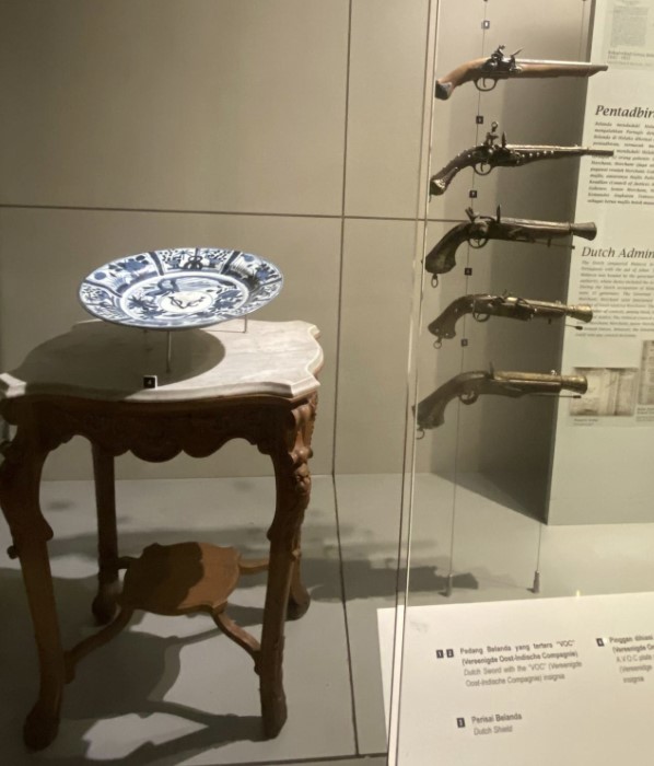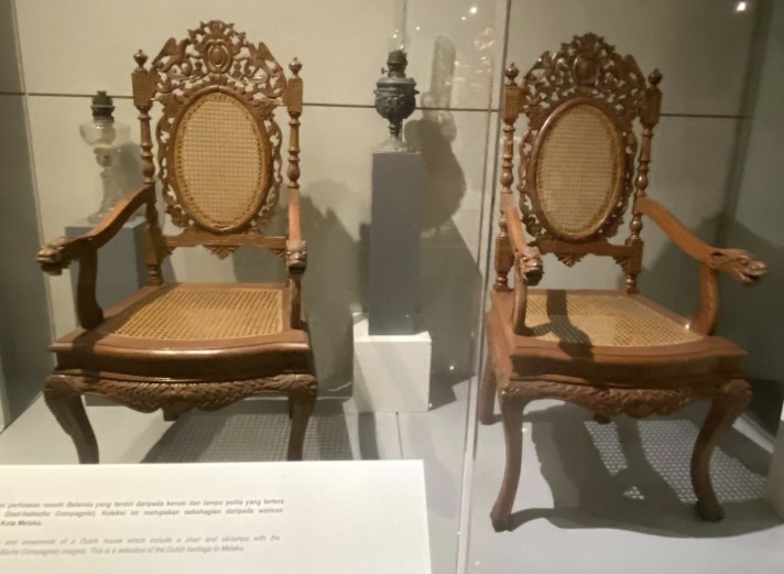 나뭇잎, 대나무, 석류 모티브가 그려진 이 VOC청화 백자 접시는 믈라카를 포함한 네덜란드의 모든 식민지에서 VOC 회사의 선물로 사용되었습니다. 이 접시는 VOC의 브랜드와 임직원들의 권력을 상징했습니다. 정교하게 조각된 이 나무 안락의자는 네덜란드와 자바의 예술이 혼합되어 있는 것을 보여줍니다. 꽃과 나뭇잎, 독수리와 같은 우아한 모티브가 새겨져 있고, 등받이와 앉는 부분은 이 지역의 라탄이 사용되었습니다.