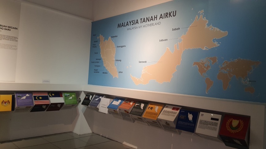국립박물관 입구 양쪽에는 말레이시아의 역사와 문화를 개괄적으로 보여주는 두 개의 거대한 벽화가 이태리산 유리 모자이크로 새겨져 있습니다. 이 벽화는 다툭 총 라이 통(Datuk Cheong Lai Tong)이라는 작가의 작품으로, 말레이시아 초대 총리인 툰쿠 압둘 라만(Tunku Abdul Rahman)이 주최한 응모전에서 수상한 후 1962년에 제작되었습니다. 동쪽 벽화의 제목은 ‘말라얀 역사의 장면들’이고, 서쪽 벽화는 ‘말라얀 공예품들과 장인’입니다. 제목에 ‘말레이시아’가 아니라 ‘말라얀(Malayan)’이라는 단어를 쓴 이유는 ‘말레이시아’라는 국가 명칭은 이 작품이 만들어진 이후인 1963년에야 탄생했기 때문입니다.