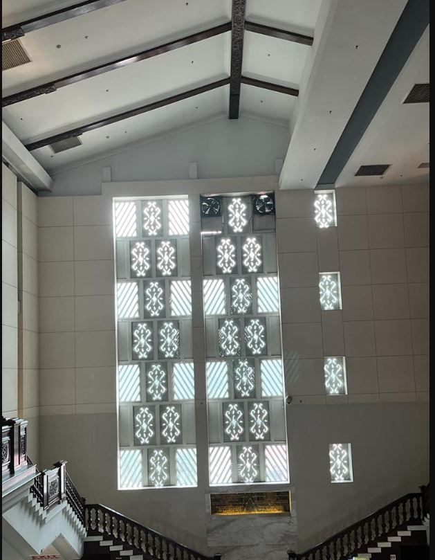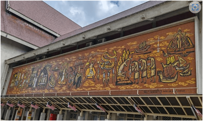 박물관 건물 정면에는 말레이시아의 역사와 문화를 이태리산 유리 모자이크로 표현한 두 개의 거대한 벽화가 있습니다. 이 벽화는 1962년, 다툭 쳉 라이 통(Datuk Cheong Lai Tong)이라는 작가가 말레이시아의 초대 수상인 툰쿠 압둘 라만(Tunku Abdul Rahman)이 개최한 응모전에서 수상을 한 후 만들어졌습니다. 동쪽 벽화의 제목은 ‘말라얀 역사의 장면들’이고, 서쪽 벽화는 ‘말라얀 공예품들과 장인’입니다. 말레이시아를 ‘말라얀(Malayan)’이라고 표기한 것을 볼 수 있는데, ‘말레이시아’라는 국가 명칭은 박물관이 완공된 직후에 생겼기 때문입니다.