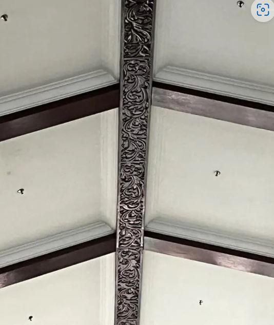 홀의 앞부터 뒤까지 늘어진 천장의 나무 들보를 살펴보면, 복잡하게 조각된 장식을 볼 수 있습니다. 이러한 장식은 중앙의 들보에서 서까래까지 계속됩니다.